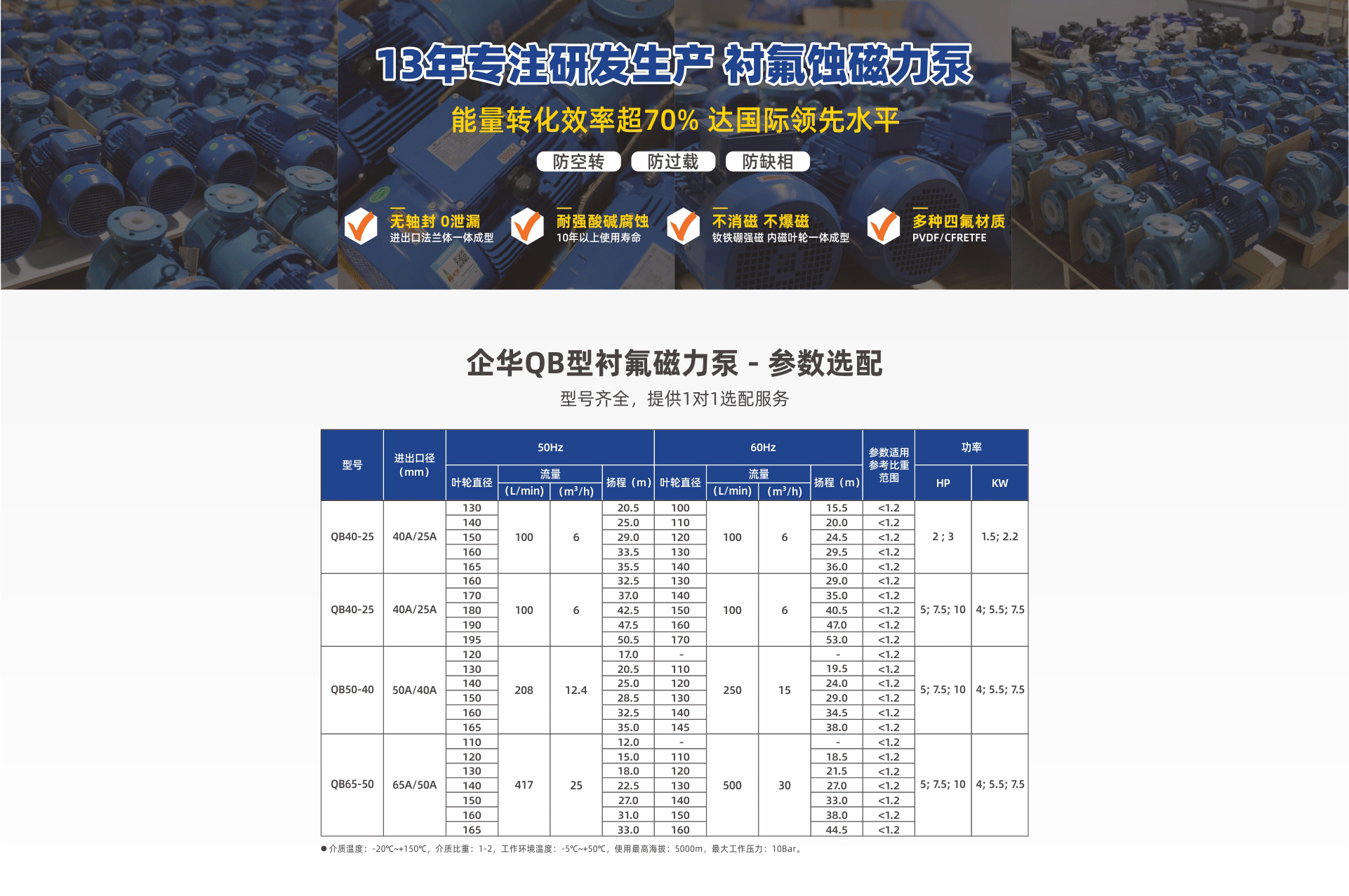 耐强腐蚀,可输送高浓度药水、高纯度药水及超纯水;采用无机械轴封设计,承压强度高,无泄漏,性能稳定,噪音低振动小。